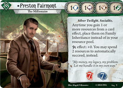 As people already familiar with him from FFG’s board and card games will know, Preston’s subtitle is “the Millionaire” and he has usually functioned in games by either